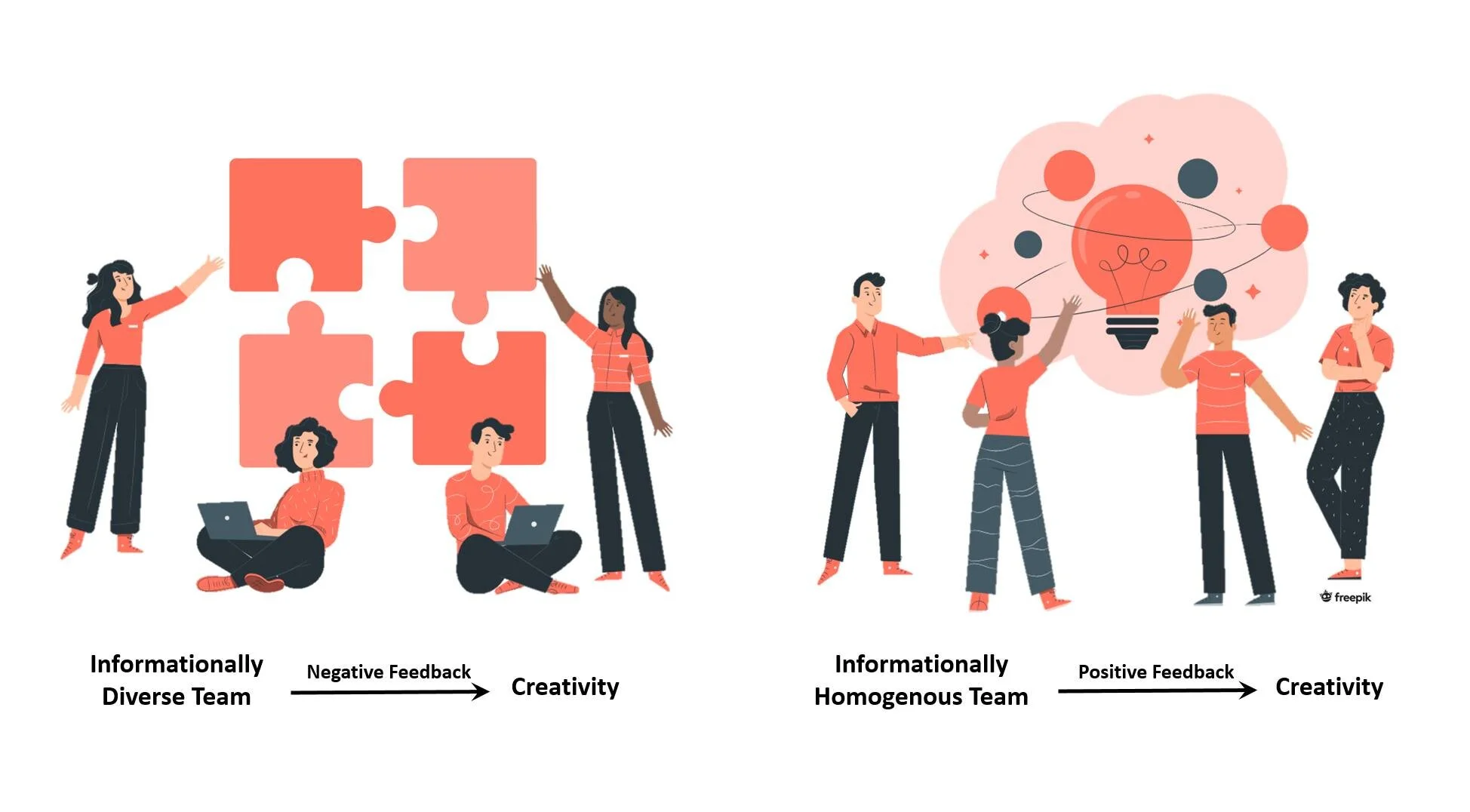 To answer this question, Hoever, Zhou, and van Knippenberg (2018) focused on team members’ information resources and how diverse these resources were. Typically, informational diversity stems from different functional backgrounds (by which members have different subject expertise) and from different job positions in organizations, that confronts members with informational asymmetry with regard to internal matters. The authors conducted an experiment with 234 students from a Dutch university by splitting students in four groups who either had diverse or homogenous information and who received either positive or negative feedback. They then measured the effect of these four conditions on team creativity.