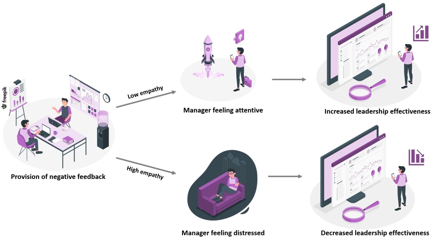 Complementing these two studies, a third one asked managers to describe an incident where they gave negative feedback to their employee (in real life) and then answer few questions and perform simple tasks. Based on these three studies, Simon and colleagues found that after providing negative feedback empathic managers feel less attentive (alert, engaged and concentrated) and more distressed (on edge, uneasy, or tense) which results in them becoming less effective in their leadership. In contrast, managers with lower empathy report feeling more attentive and less distressed, which resulted in them being more effective in their leadership. The reason is that empathy makes people feel close to their interlocutors and put themselves in the shoes of the feedback recipient, which ultimately affects your emotions and level of energy.