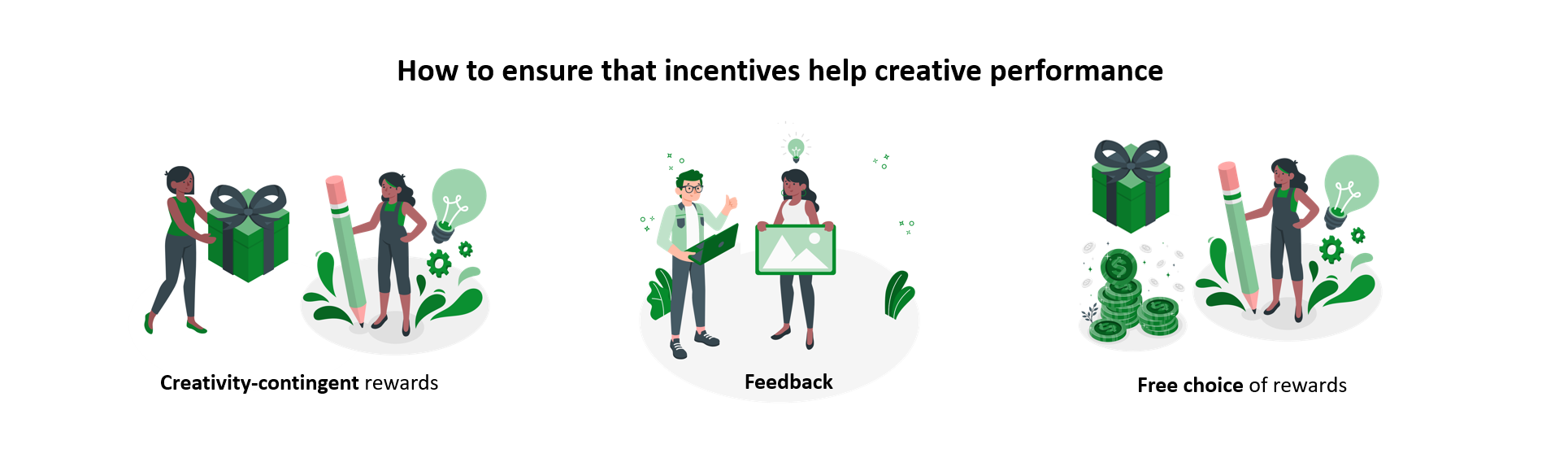 In another meta-analysis of 60 different studies, Byron and Khazanchi (2012) explored the effect of incentives on creative tasks. These authors included in their analysis quite diverse research, conducted in and outside of the workplace with samples including adults as well as children, which makes the findings generalizable to multiple situations. The results, once again, reveal that rewards are beneficial to creative performance, provided that some specific conditions are met. First, only rewards that are creativity-contingent lead to stronger creative performance. This is because these incentives clarify that creativity is valued and expected. On the opposite, rewards that are performance-contingent or completion-contingent (i.e., associated to the level of performance reached and the completion of a task, respectively) are negatively associated with creative outputs. Second, creativity-contingent rewards are more effective when combined with feedback that helps people understand how to improve their attempts (find out more on how feedback impacts creativity in our Digest 20). Third, creativity-contingent rewards that leave people opportunities to choose (e.g., which reward they want) are even more successful at improving creativity.